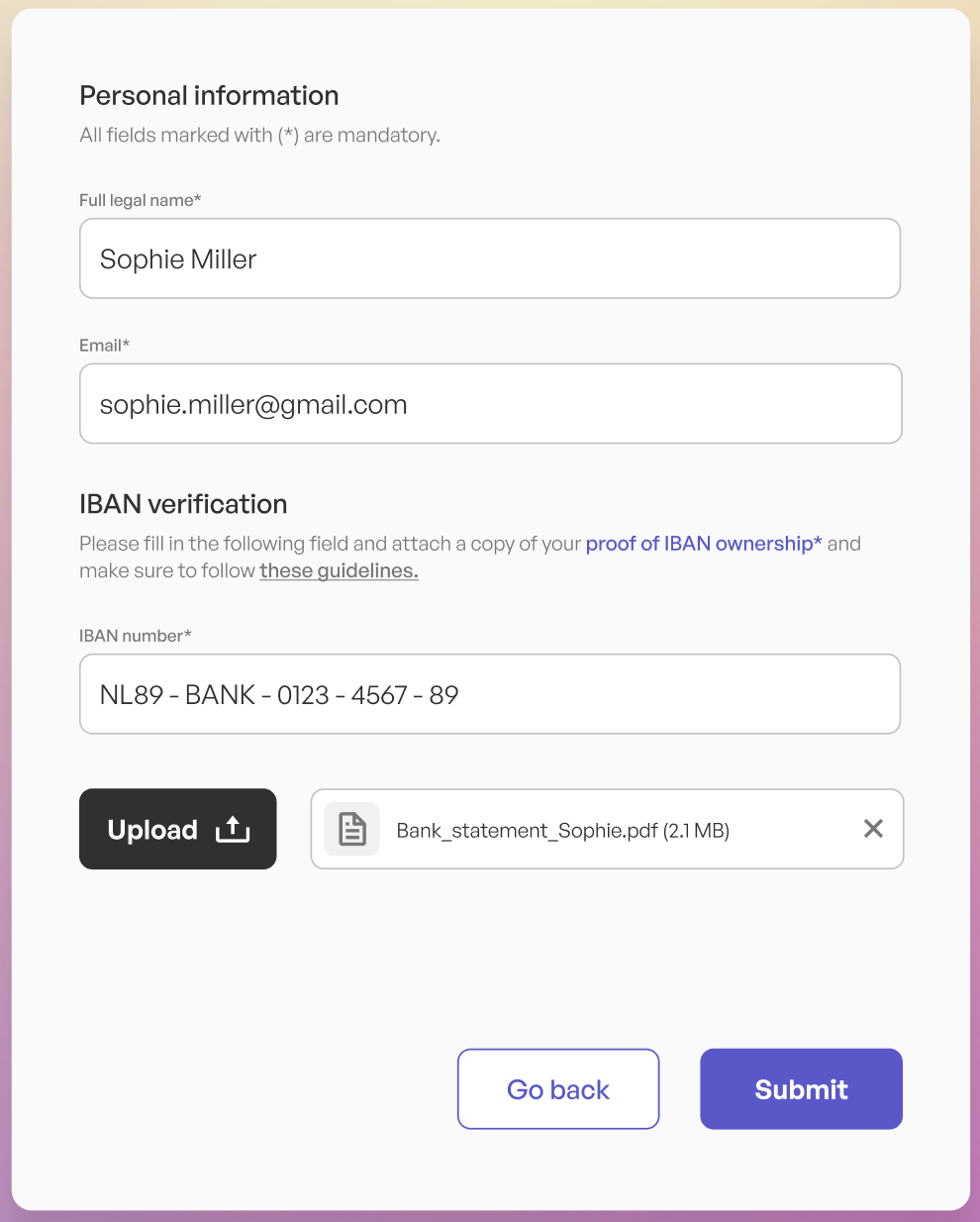 3. Share the link with the seller. When the seller opens the link, they are able to add their details that are required for the KYC process. By default, the link is valid for 48 hours, but can be set to 2 weeks using the expirationTime parameter. We will show the required data fields based on the default KYC tier that applies to your marketplace model.