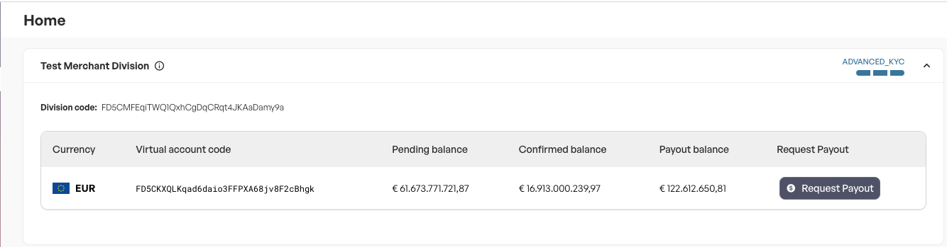Division payouts can be requested on the home screen. Click the “Request Payout” button, then fill in the payout request form