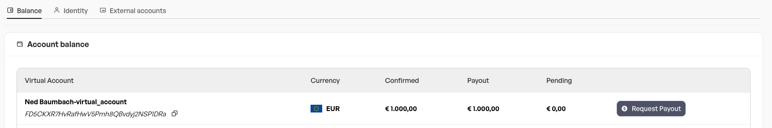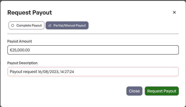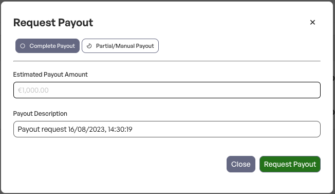 In the form you can choose between 1) Complete payout and 2) Partial payout. The complete payout will create a payout request for the full amount available on the virtual account whilst the partial payout will let you pick a potentially smaller amount to be paid out